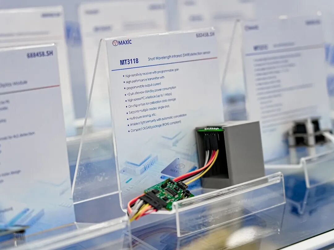 在光学传感器领域,我们重点展示了DTOF光学测距、环境光检测、接近检测、光学追踪传感、屏下二合一、RGB+Flicker检测等多款智能感知芯片。此外,最新产品皮肤活体检测光学传感器MT3118也首次亮相展会。该芯片集成双波长红外光学系统,通过水分吸收差异区分皮肤与其他物体,可实现高可靠的佩戴检测。