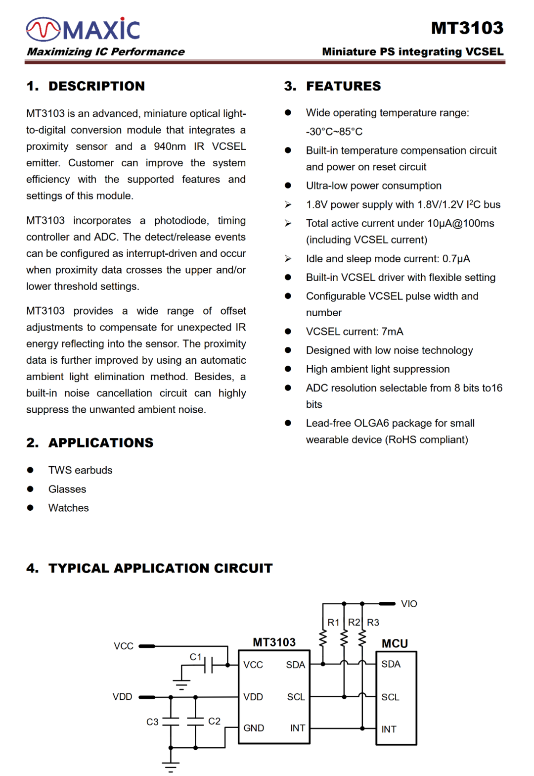 MT3103 is a compact, ultra-low-power digital optical proximity sensor with a high signal-to-noise ratio, an integrated 940nm VCSEL and standby power consumption as low as 0.7μA. Featuring Maxic’s proprietary adaptive noise suppression algorithm, it significantly improves in-ear detection efficiency. The chip is mainly used in TWS/OWS wireless earbuds, VR/AR smart glasses, smartwatches, and other portable smart devices.