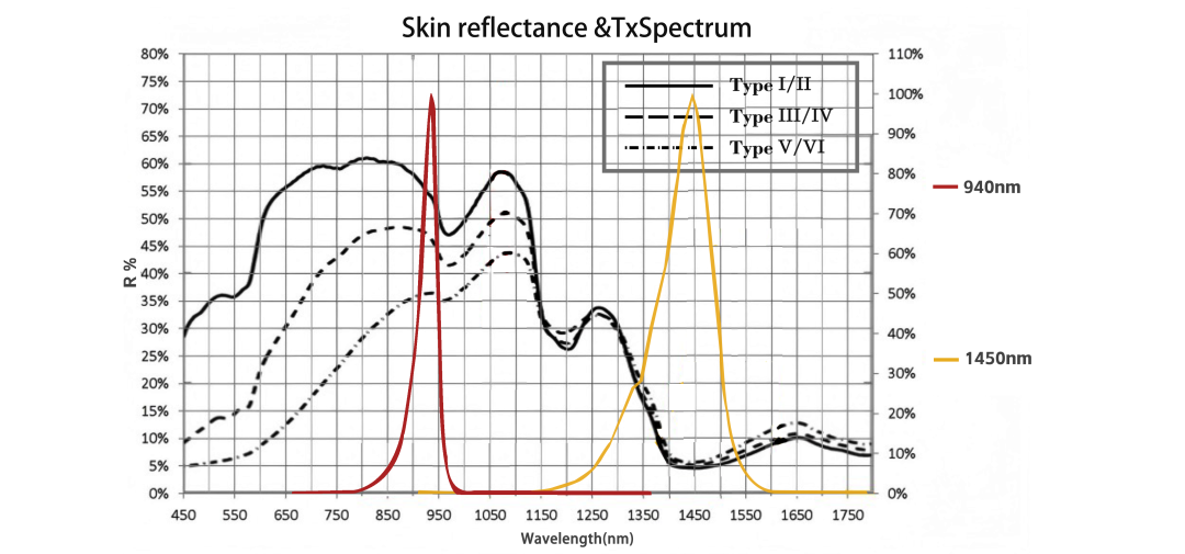 MT3118 integrates 940nm and 1450nm dual infrared channels. The 940nm channel is suitable for conventional reflective detection, while the 1450nm channel leverages strong water absorption characteristics to accurately quantify skin surface moisture. Through dual-wavelength data fusion and adaptive algorithms, the sensor enables high-accuracy human skin recognition, effectively mitigating in-pocket false triggers. In addition, it supports non-invasive evaluation of skin hydration, providing a reliable data foundation for innovative applications such as personalized skincare reminders.